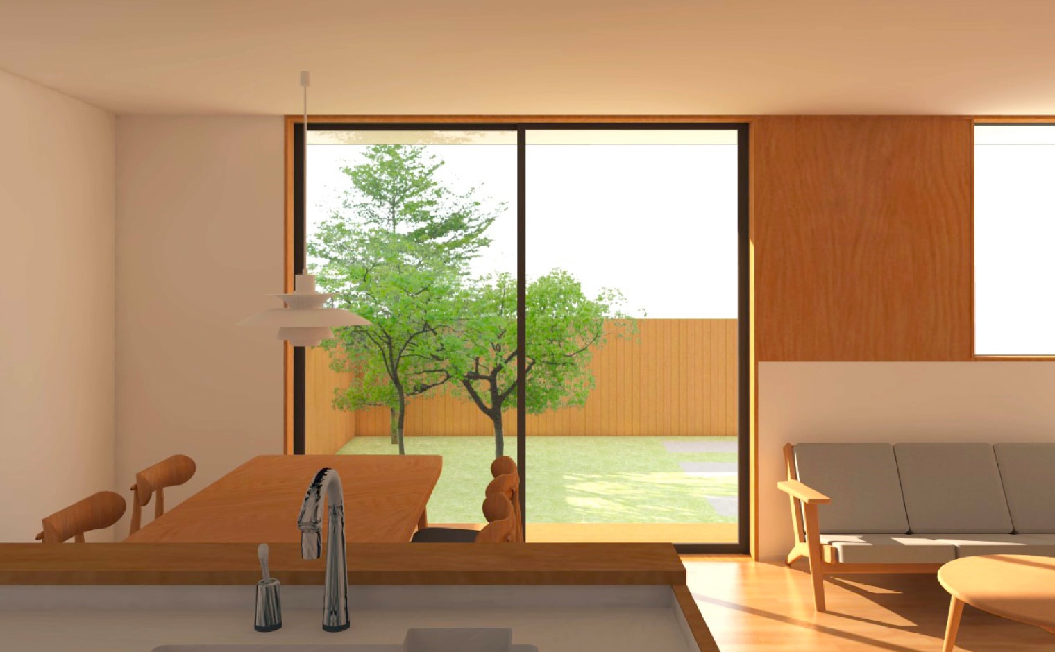 キッチンからリビング、そして庭へと視線が抜ける開放的な空間。家族の時間を包み込む、心地より太陽の日差し。隣でそっと見守れるスタディーコーナーと、外遊びで汚れても浴室に続く玄関に工夫を凝らして、家族みんなが快適に過ごせる、思いやりに満ちた家が完成しました。